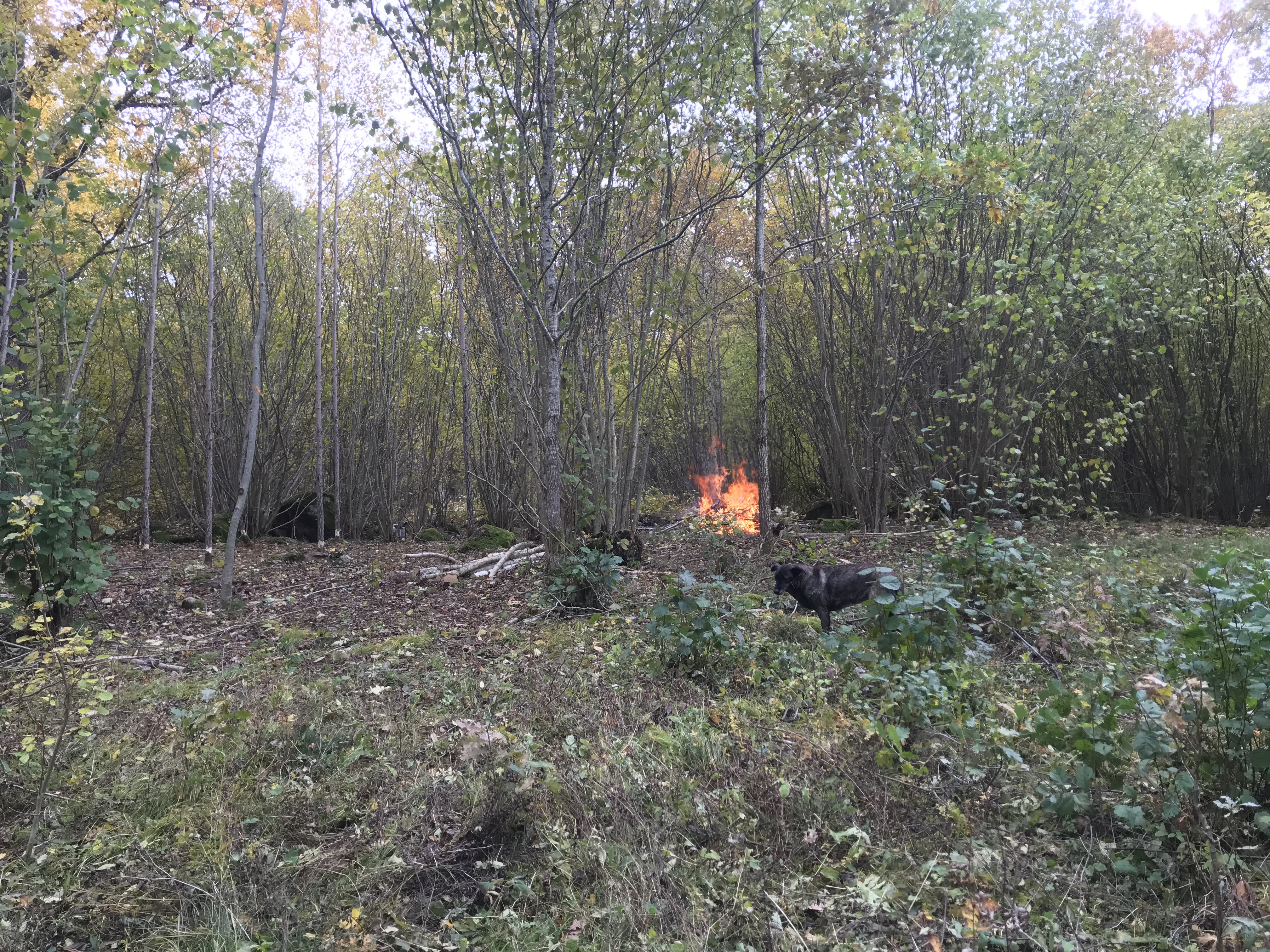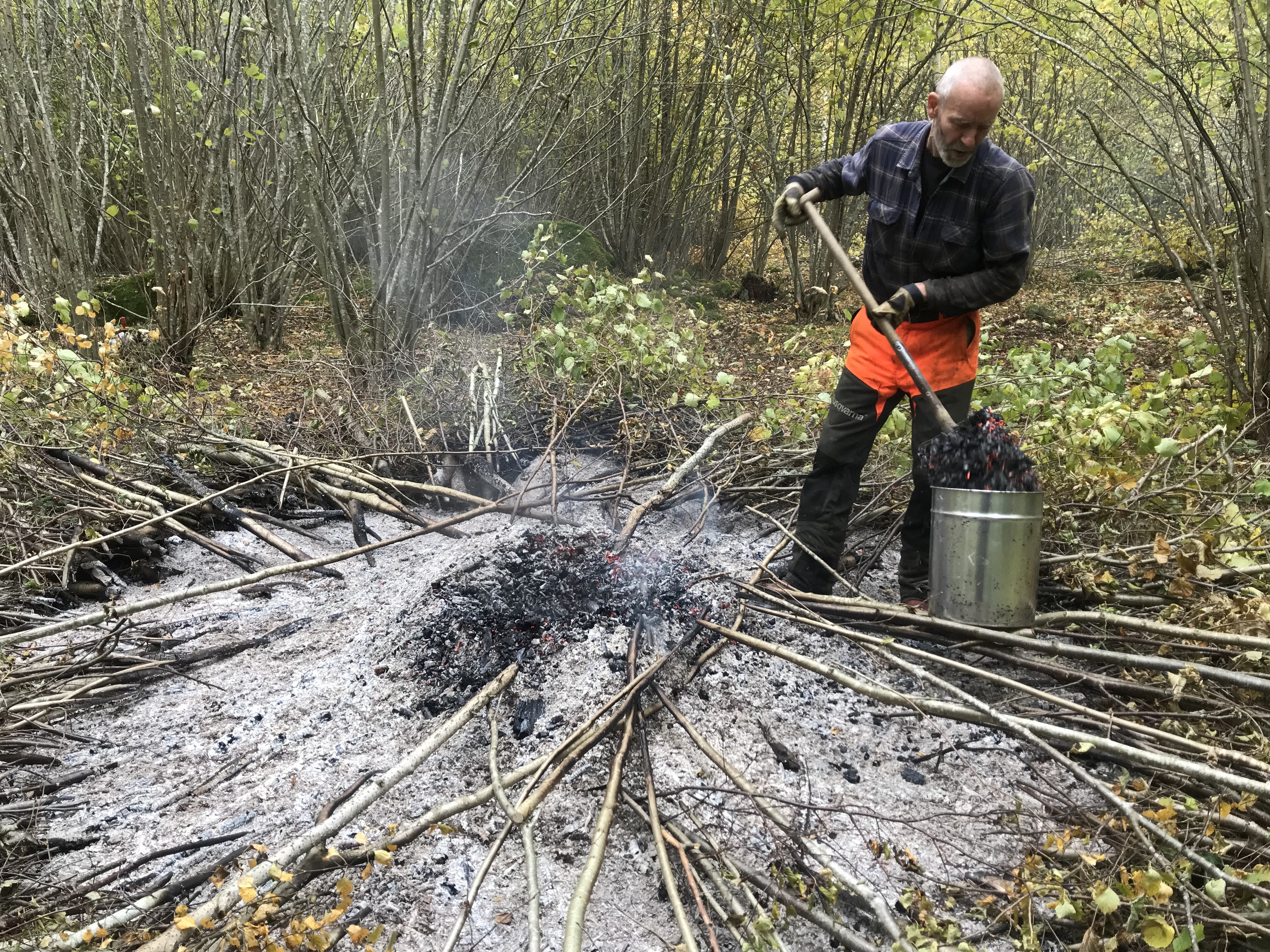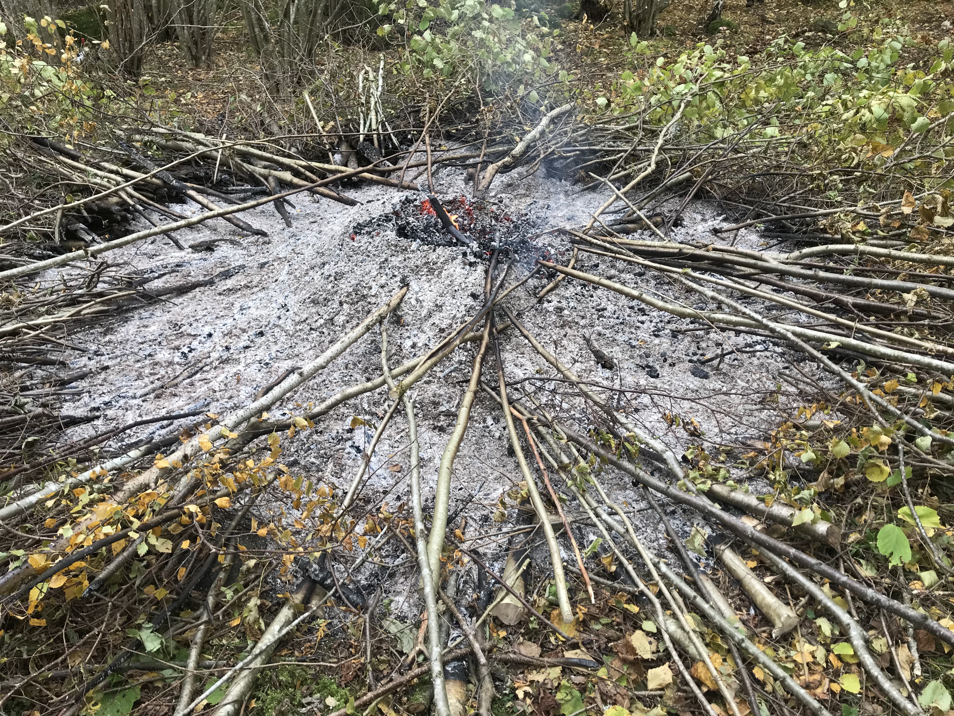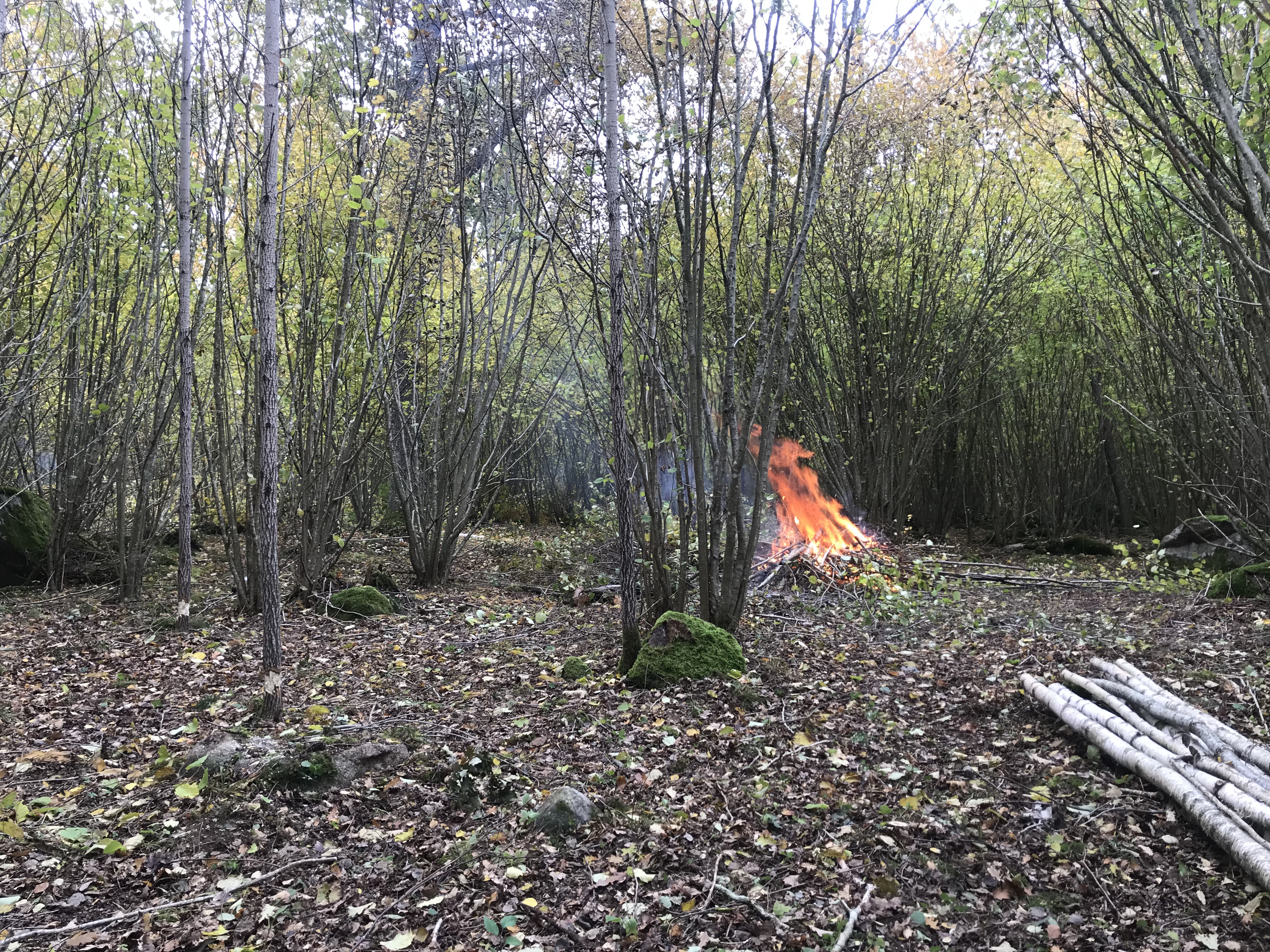 Det är oktober och löven börjar bli lite höstfärgade. Hasselbuskarna är fortfarande gröna men man kan se de självlysande brandgula asparna som sticker upp mellan hasselbuskarna. Håkan har börjat röja här och öppnar upp i den bitvis väldigt täta hasselskogen. Han sågar stubbarna tätt intill marken så att man inte snubblar på dem när man ska gå här senare. Lövet eldar vi upp på en gång.