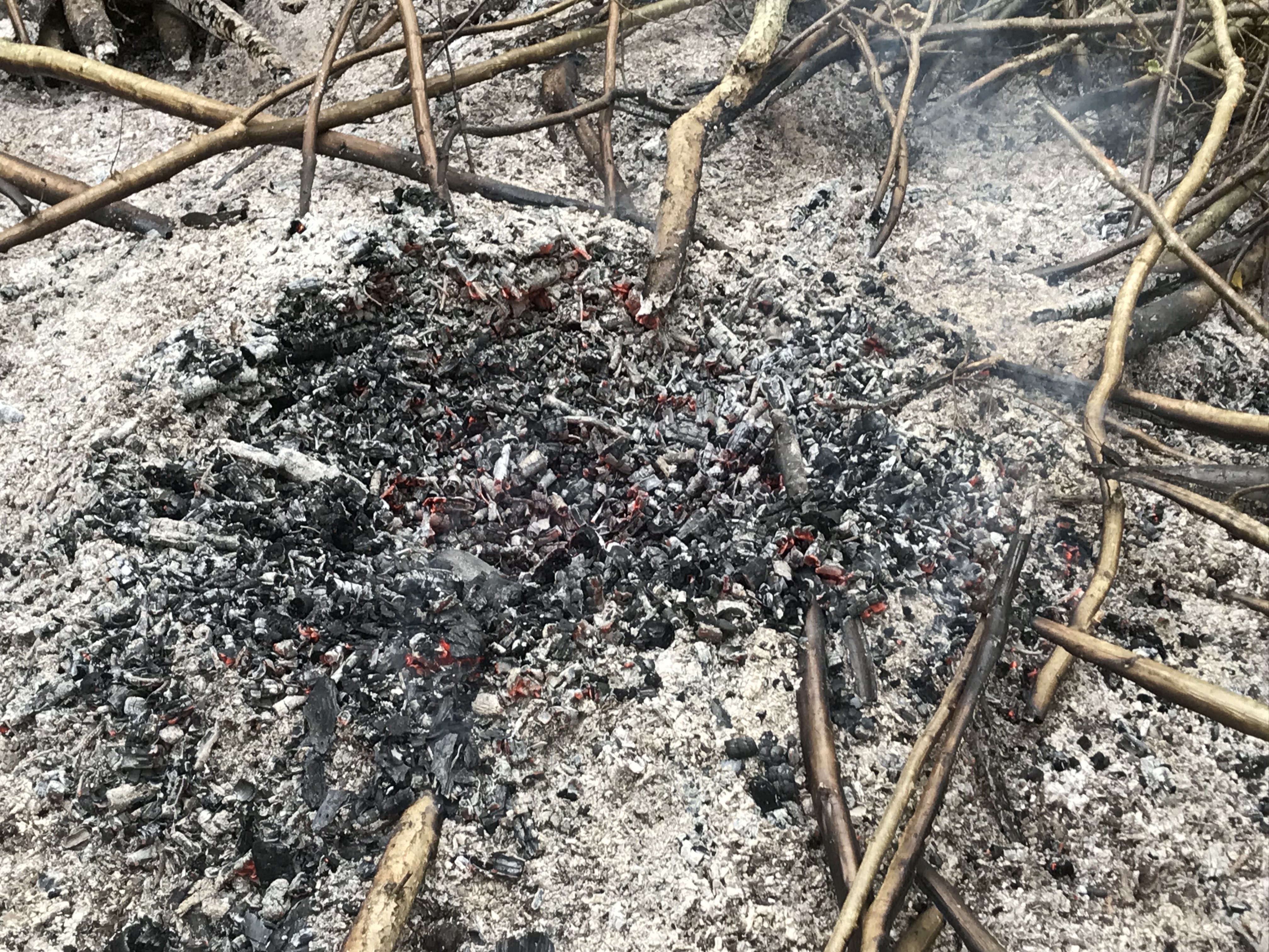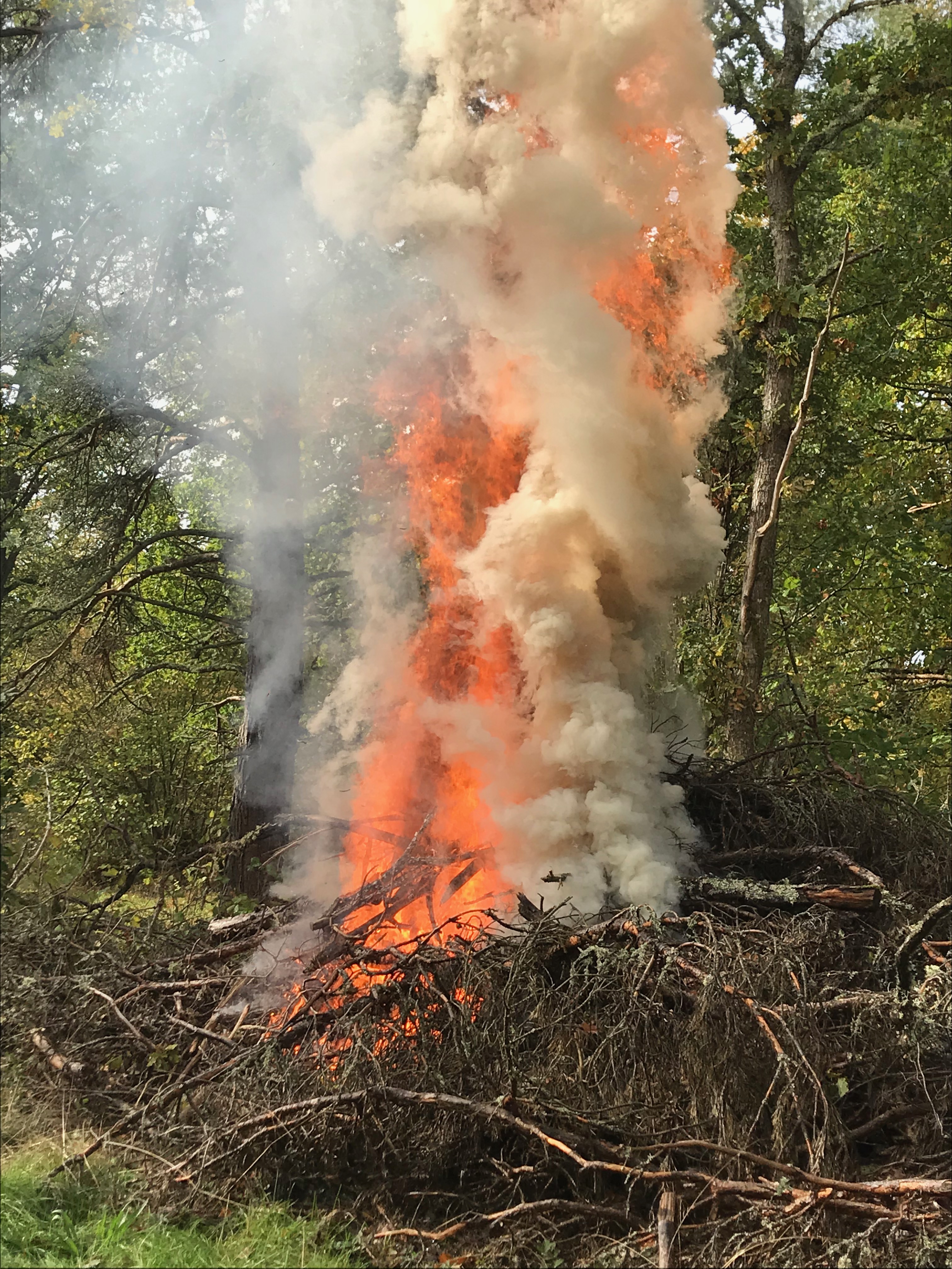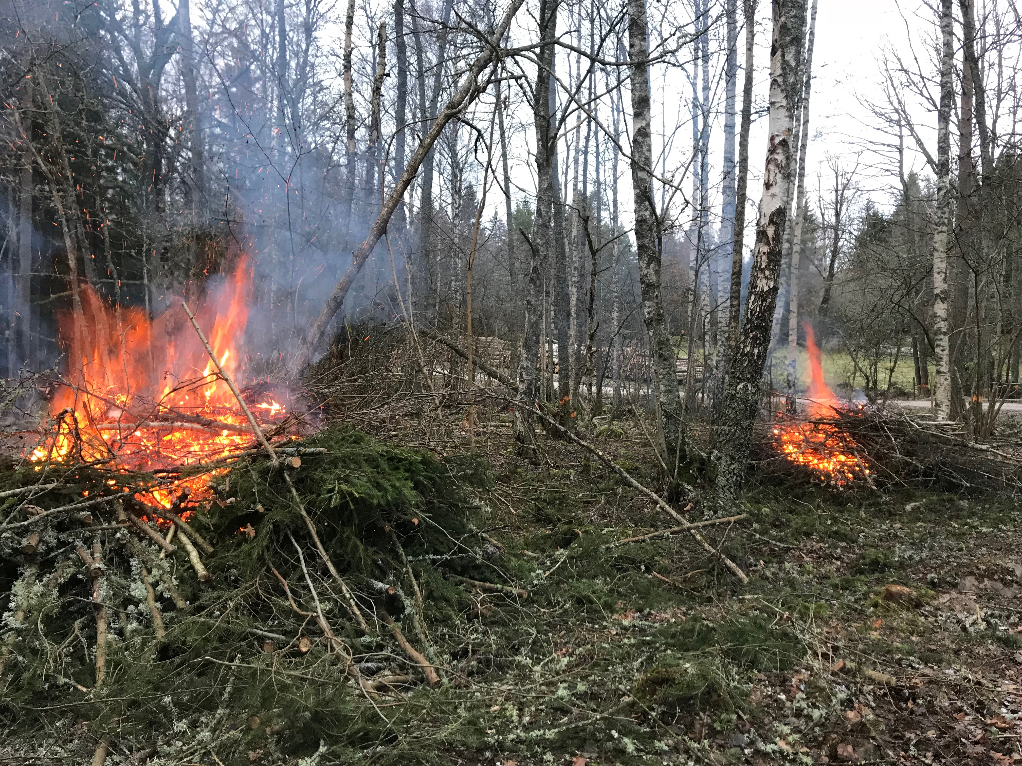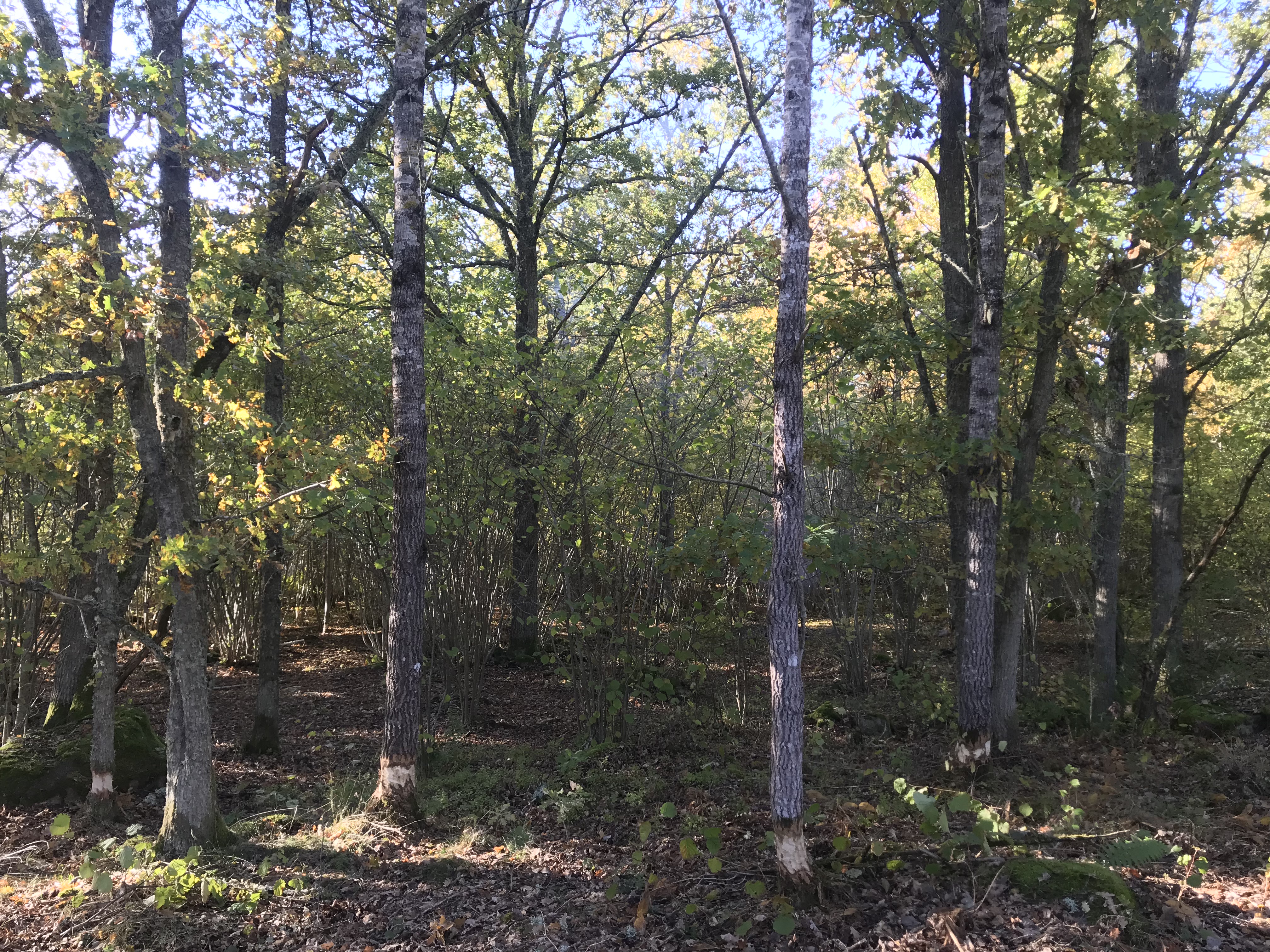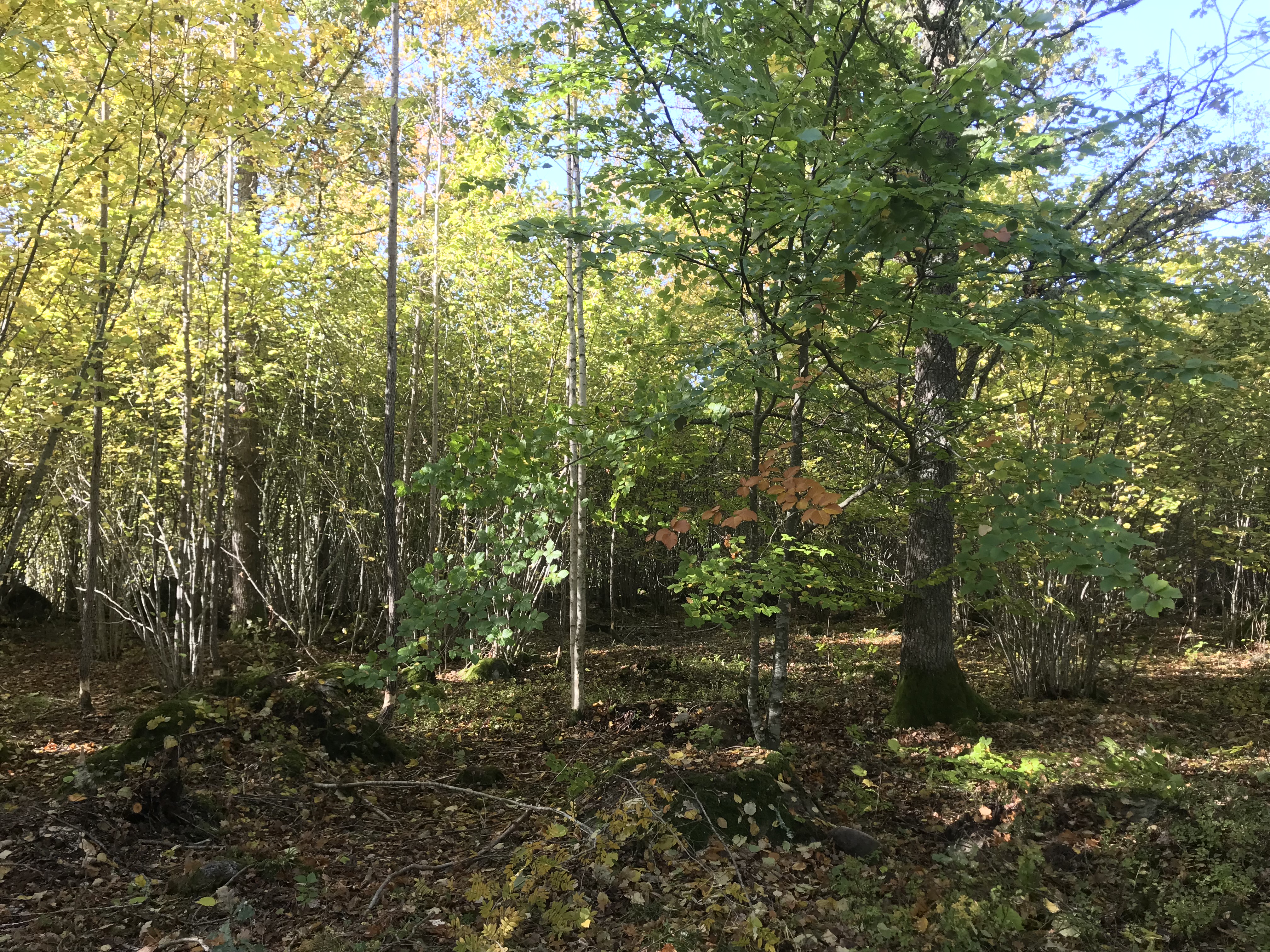 Det är oktober och löven börjar bli lite höstfärgade. Hasselbuskarna är fortfarande gröna men man kan se de självlysande brandgula asparna som sticker upp mellan hasselbuskarna. Håkan har börjat röja här och öppnar upp i den bitvis väldigt täta hasselskogen. Han sågar stubbarna tätt intill marken så att man inte snubblar på dem när man ska gå här senare. Lövet eldar vi upp på en gång.